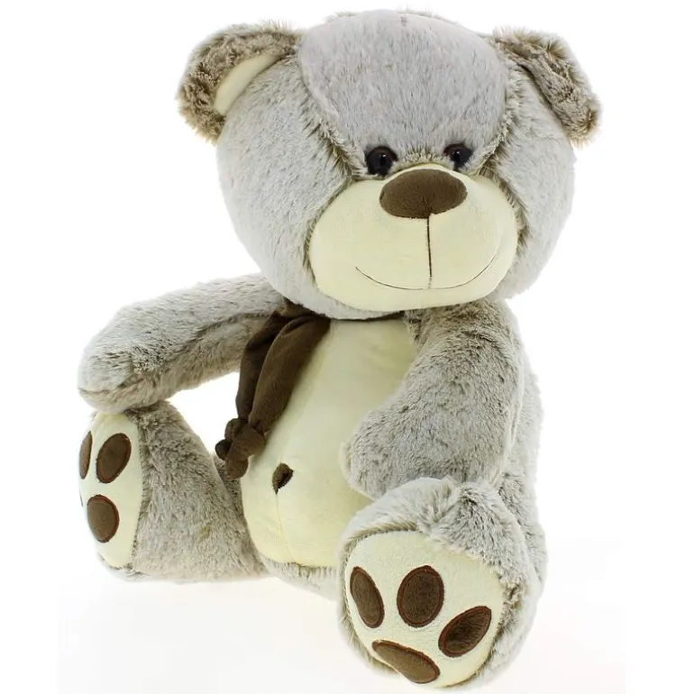 Peluche osito de tacto muy suave de 40 cm disponible en dos colores. Lleva una pequeña bufanda anudada al cuello.