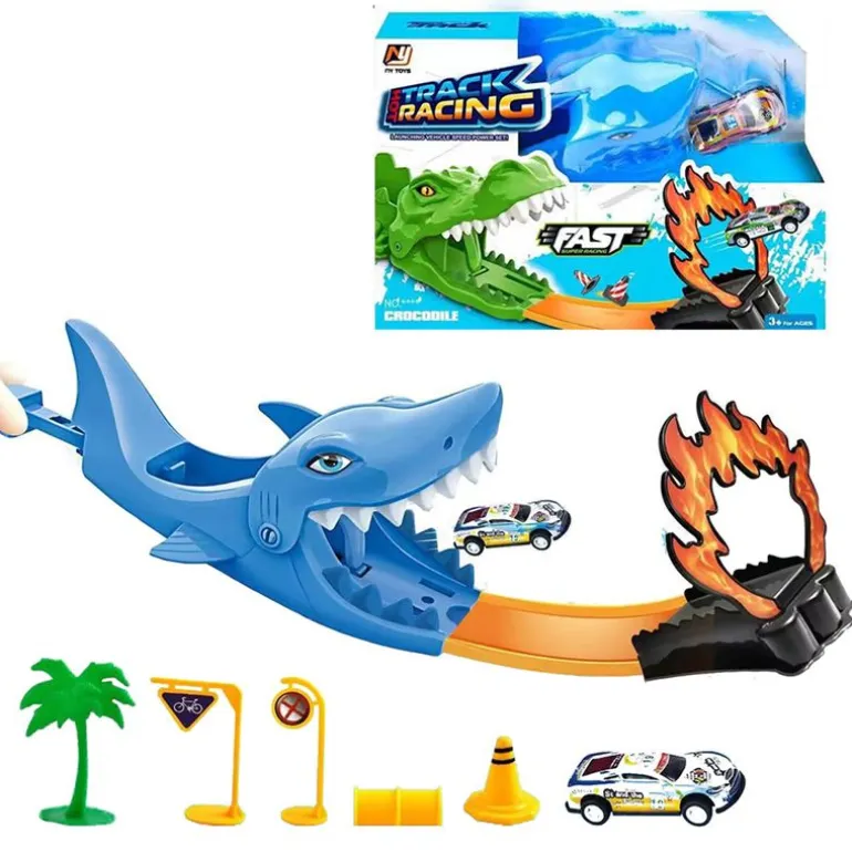 Emocionante pista de carreras con diseño de tiburón, donde los autos deben atravesar su enorme boca y superar obstáculos espectaculares.