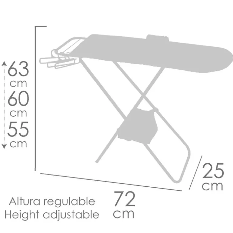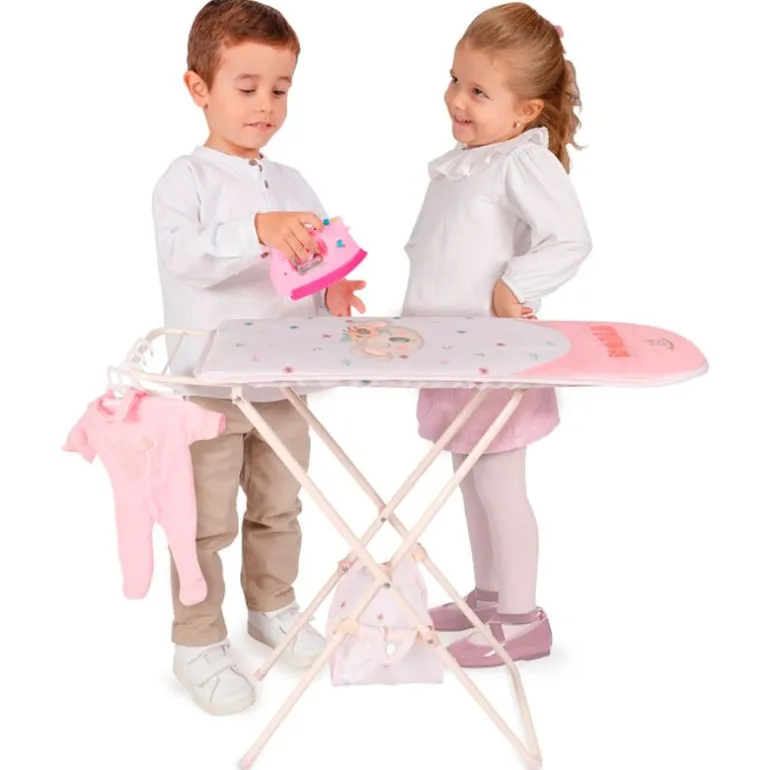 Planchador de color blanco y rosa con diseño especial de la línea Koala, estructura plegable, bandeja de tela inferior, una plancha de juguete y 3 perchas de plástico. El planchador tiene una altura de 63 cm de alto (regulable a 50 y 60 cm), 72 cm de ancho y 25 cm de fondo. Recomendado a partir de 3 años.