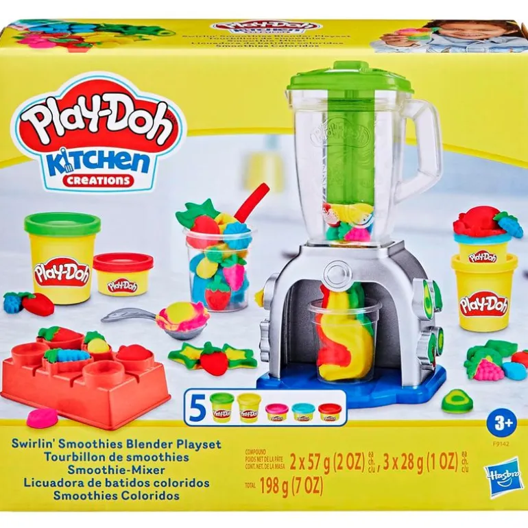 Licuadora de Batidos Coloridos de la colección Play-Doh Kitchen Creations. Podrás moldear frutas, verduras y otros comestibles de juguete y presionarlos por la licuadora para servir en vasos. Los más pequeños de la casa podrán usar el émbolo para crear crema batida de juguete. Incluye 2 vasos que los más pequeños pueden usar para servir y compartir batidos de juguete. Recomendado a partir de 3 años.