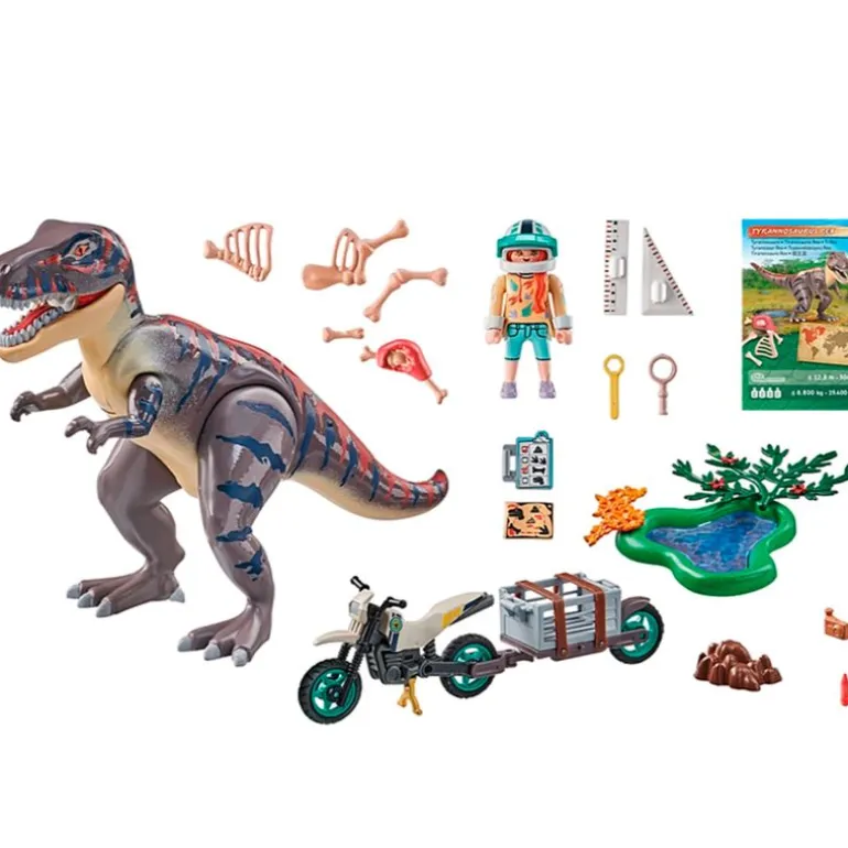 Pack de la colección Playmobil Dinos en el que encontrarás una figura de Playmobil, un T-Rex, una moto con remolque, un charco con una huella, una lupa, una cámara, un mapa y un equipo de investigación. El dinosaurio es articulado y mueve la boca. Recomendado a partir de 4 años.