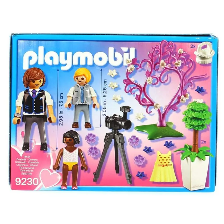 ¡Se está celebrando la boda y el fotógrafo ha decidido fotografiar a los niños de las flores! Lo tiene todo preparado para la sesión, con accesorios como un fondo de corazón con flores, pequeños arbustos y una cesta de picnic. Incluye las 3 figuras del fotógrafo con su cámara y los 2 niños. El vestido de la niña está hecho de silicona, lo que hace que sea fácil que quitar y poner. Recomendado a partir de 4 años.