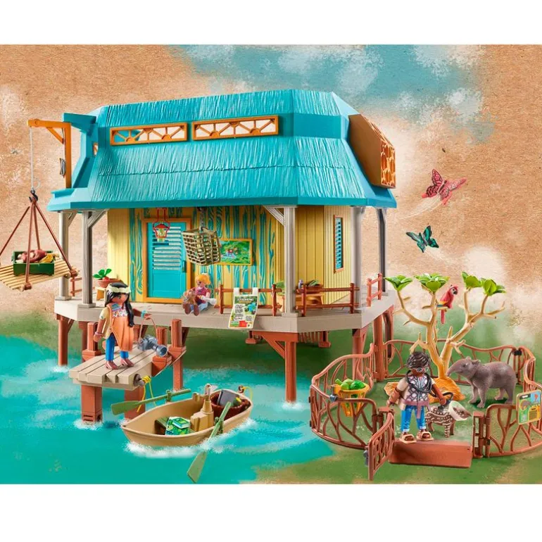 Centro de Cuidado de Animales de la colección Playmobil Wiltopia. En este centro de cuidados de animales se cuidan los animales de la selva tropical. En el interior encontrarás recintos, área veterinaria con mesa de tratamiento, rayos X, una lámpara de color, laboratorio de investigación, embarcadero con bote de remos y montacargas. Amplios accesorios, tarjeta de conocimiento de animal ‘Tapir’ con emocionante contenido de audio. Incluye 3 figuras Playmobil y animalitos. Sus dimensiones son de 58 cm x 52 cm x 33 cm aproximadamente. Funciona con 2 pilas AAA NO incluidas. Recomendado a partir de 4 años.