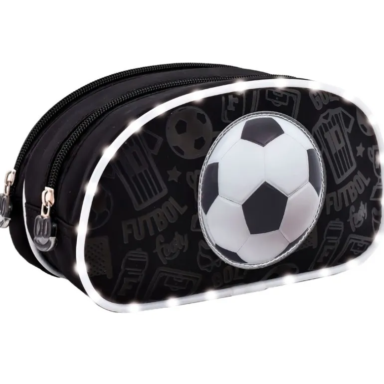 Estuche soccer que reproduce luces LED blancas. Dispone de dos compartimentos para que puedas guardar en su interior tus complementos escolares. Sus dimensiones 22 cm x 10 cm x8 cm aproximadamente.