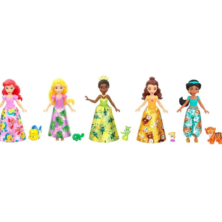 Contiene las mini muñecas articuladas de Ariel, Tiana, Bella, Jasmine y Rapunzel. Su tamaño es de 8.9 cm aproximadamente.