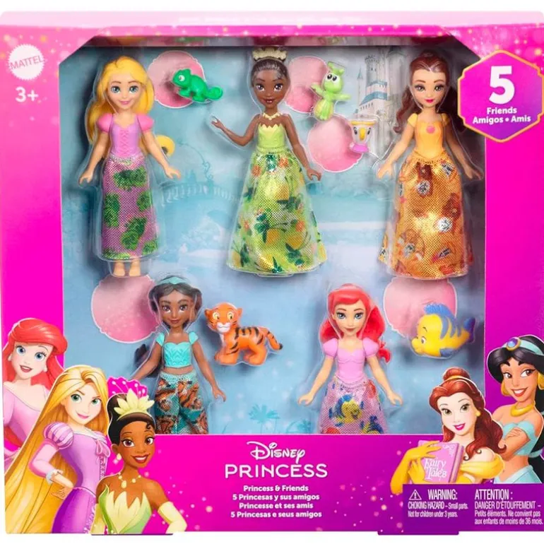 Pack que contiene 5 muñecas pequeñas inspiradas en las princesas Disney y sus amigos, este adorable conjunto de personajes es ideal para crear historias inspiradas en las películas de Disney.