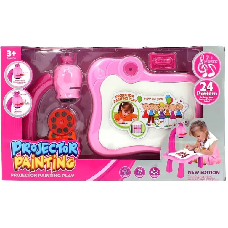 Proyector infantil con luces y sonidos de color rosa.