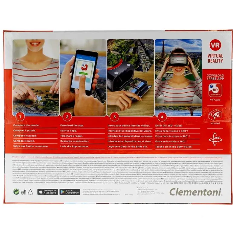 Disfruta de una visión panorámica de Nueva York con este puzzle, de 1000 piezas, de una impresionante vista aérea de los rascacielos de la ciudad. La nueva colección de puzzles VR de Clementoni te permitirán disfrutar de una auténtica experiencia virtual dentro del rompecabezas. Descárgate la aplicación gratuita y coge las gafas de realidad virtual que se incluyen en el pack para disfrutar de la escena. La aplicación reconocerá la imagen del dispositivo y, al utilizar el visor, obtendrás una visión de la imagen del puzzle de 360º. El puzzle montado mide, aproximadamente, 50 x 69 cm.