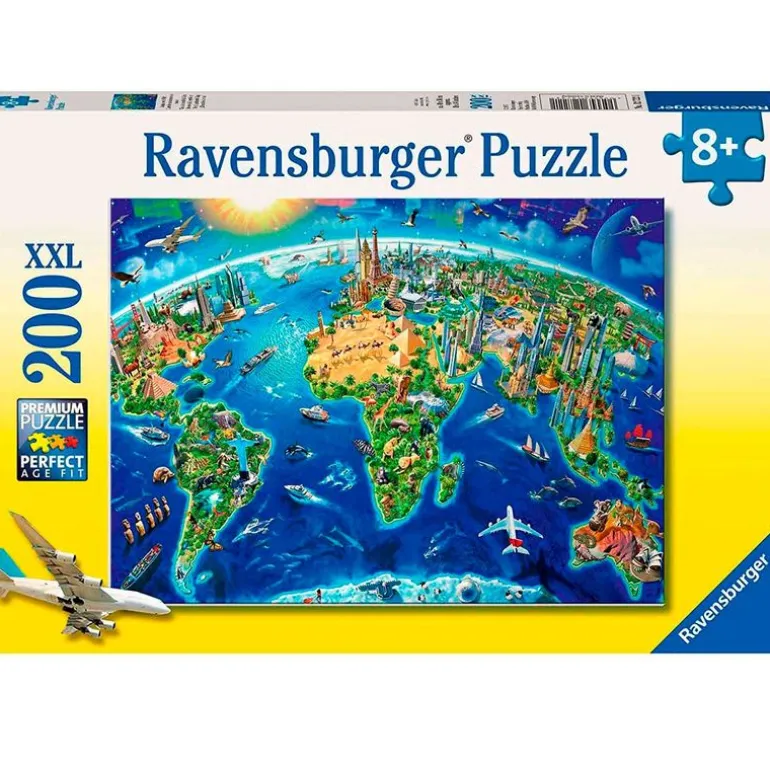 Puzzle compuesto de 200 piezas con las que podrás montar la imagen del mundo y algunos de sus monumentos más importantes. Recomendado a partir de 8 años.