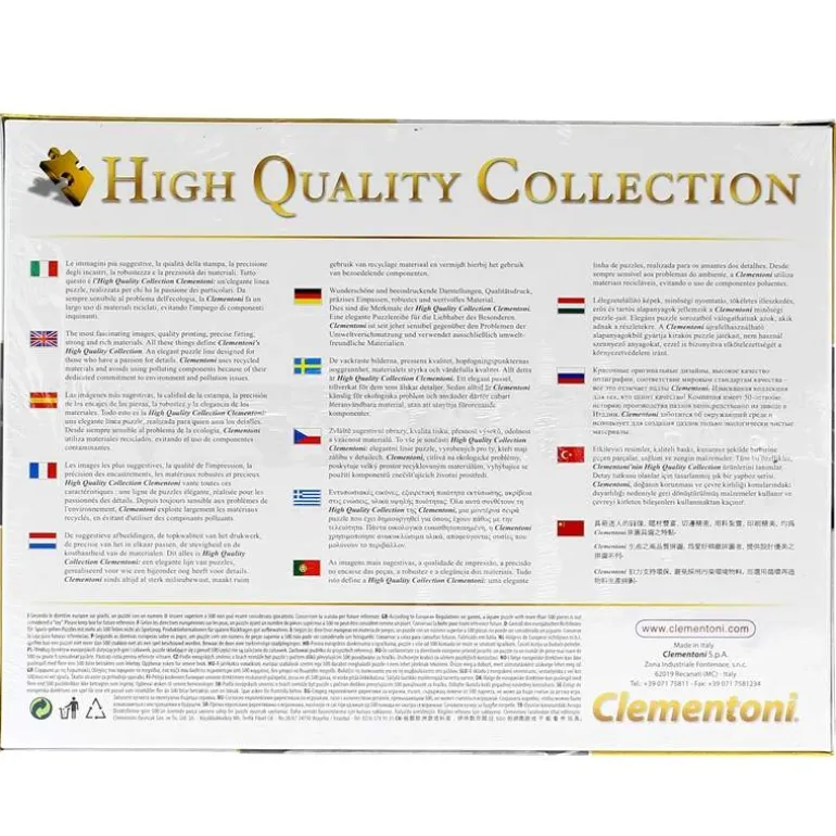 Puzzle de 1000 pizas de la colección platinum de Clementoni con una representativa imagen de la ciudad de Nueva York, en la que aparecen de fondo, en blanco y negro, los enormes rascacielos de la ciudad y, en primer plano, contrastando con el color de fondo, la imagen frontal de un taxi amarillo. El puzzle montado mide, aproximadamente, 69 x 50 cm.