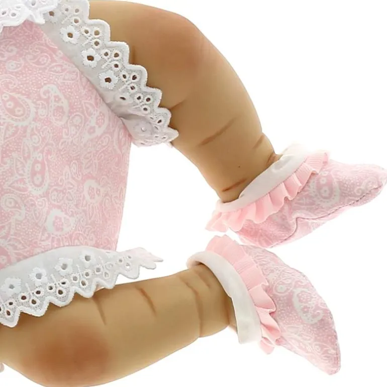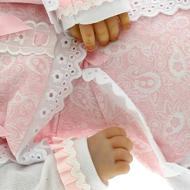 La carita de este bebé Reborn refleja tranquilidad y ternura en un sueño profundo. Va vestida con un traje rosa a juego con gorro y patucos, y todo con detalles de pasamanería y lazos de raso.