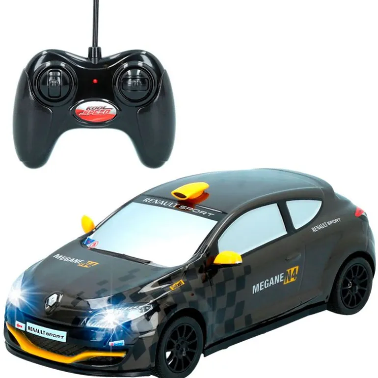 Coche teledirigido inspirado en el modelo Renault Megane Sport N4. Su escala es de 1:20 y dispone de luz en los faros delanteros, sus espejos retrovisores son flexibles y suspensión delantera. Tiene unas dimensiones de 21.5 cm x 9 cm x 7.5 cm aproximadamente. Viene acompañado de un mando radiocontrol con el que podrás moverlo en 6 direcciones diferentes. Funciona con 5 pilas AA NO incluidas. Recomendado a partir de 3 años.