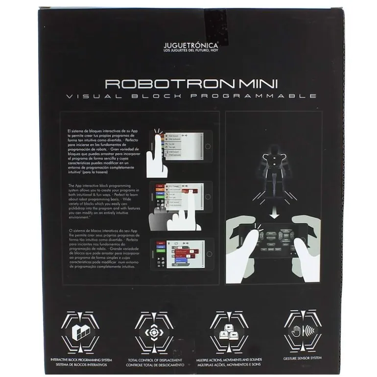 Robot educativo ideal para los más peques de la casa en el mundo de la robótica. Podrás programarlo con la emisora o con su App (compatible con dispositivos iOS 7.0 y superior y Android 4.0.3 y superior) hasta 50 acciones en una sola secuencia utilizando el sistema de bloques. Ordena y enseña al robot a que las ejecute y las guarde para volverlas a utilizar.