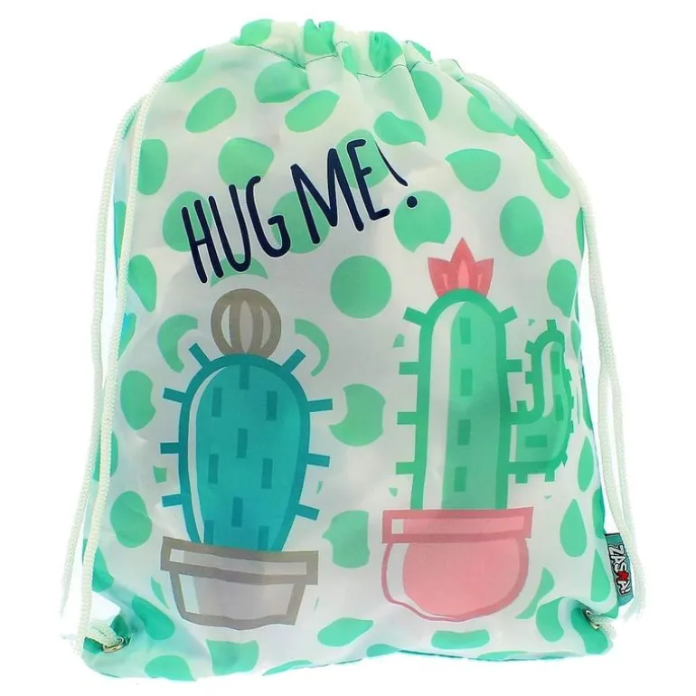 Saco para la playa en el que podrás llevar todos los accesorios que necesites. Su diseño es en color verde, con la parte frontal en blanco con topos. Tiene el divertido diseño de dos cactus, acompañados de una moderna tipografía y la frase ‘Hug Me’. Podrás colgártelo a la espalda gracias a las cuerdas de las que dispone. Sus dimensiones son de 44.5 cm x 38 cm aproximadamente.