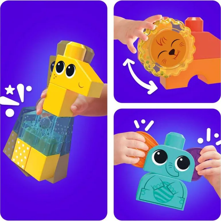 Los más pequeños de la casa vivirán una emocionante aventura construyendo este elefante, esta jirafa y este león diseñados para poder desarrollar sus habilidades sensoriales. Incluyen 3 funciones sensoriales que ayudan a fortalecer las habilidades auditivas, táctiles y visuales mientras tu bebé construye se mueve y baila con estas simpáticas criaturas. Contiene 15 piezas. Recomendado a partir de 1 año.