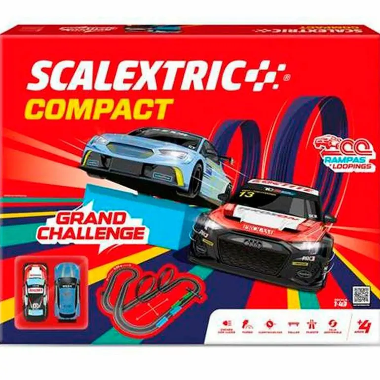 Circuito de la colección Scalextric Compact compuesto de 6.6 metros de pista acompañado de mando Wireless con turbo para experimentar la velocidad.