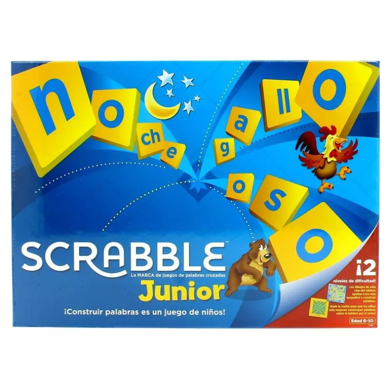 Diseñado con 2 niveles de dificultad, permite jugar a niños de una amplia franja de edad… En la opción «Palabras y Dibujos», los jugadores de menor edad deberán cubrir con sus fichas las palabras escritas en el tablero, con la ayuda de divertidos dibujos. En la opción «Colores y Puntos», los más mayores podrán formar sus propias palabras cruzadas, igual que en el clásico Scrabble, aunque con un sistema de puntuación muy sencillo, adaptado para niños. De 2 a 4 jugadores.