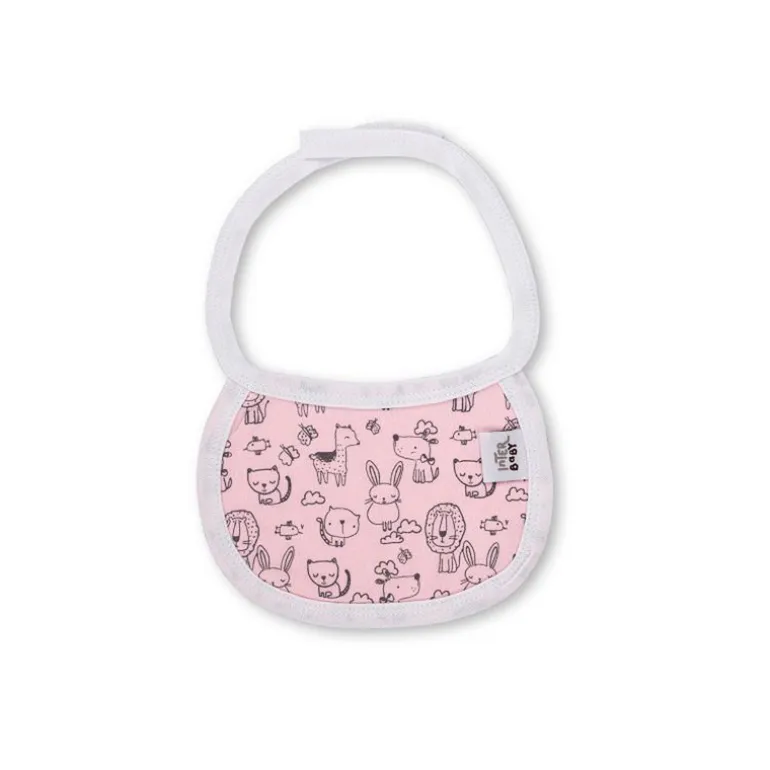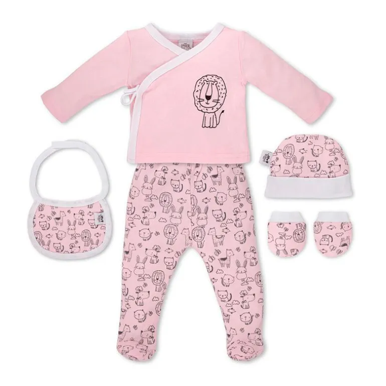 Set de nacimiento 5 piezas con animalitos ideal para hacer un regalo de 0-6m, formado por un babero, una camiseta cruzada, unos pantalones con pies, un gorro y unas manoplas.