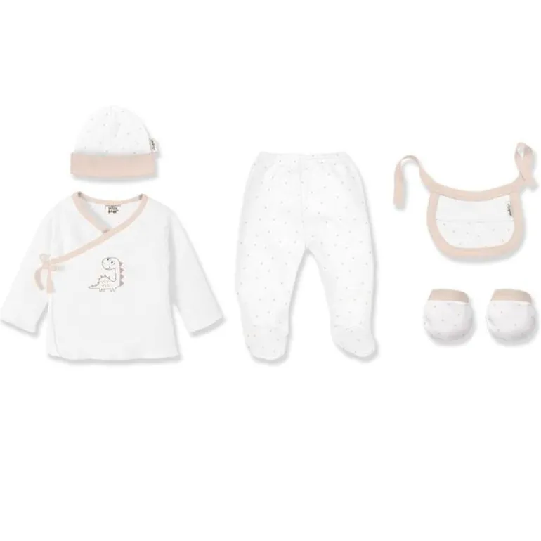 Set de nacimiento 5 piezas con dinos ideal para hacer un regalo de 0-6m, formado por un babero, una camiseta cruzada, unos pantalones con pies, un gorro y unas manoplas
