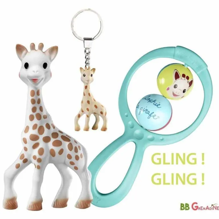 Pack de regalo que incluye un mordedor de Sophie, 1 sonajero y un llavero!! El mordedor es el primer juguete de bebé que despierta sus sentidos gracias a su textura, olor y un pitito cuando la aprietas