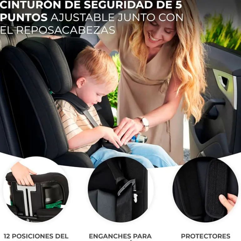 Tiene reposacebezas regulable en 12 niveles conjuntamente con el arnés.