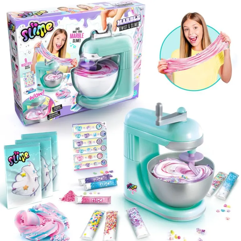 Mixer Machine de la colección So Slime ¡Con este mezclador de slime podrás convertirte en un verdadero profesional! En el interior encontrarás una guía de recetas para que puedas crear slimes únicos. Coloca el slime blanco en la batidora, añade colorante y decoraciones y mira cómo se mezcla. Funciona con 4 pilas AA NO incluidas. Recomendado a partir de 6 años.