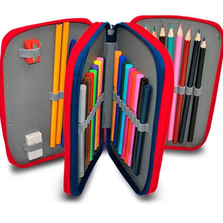 Estuche triple con diseños inspirados en el superhéroe Spiderman. En el interior encontrarás 3 compartimentos en los que incluye lápices, bolígrafo, rotuladores, lápices de colores y muchos más. Sus dimensiones son de 12 cm x 6 cm x 20 cm aproximadamente.