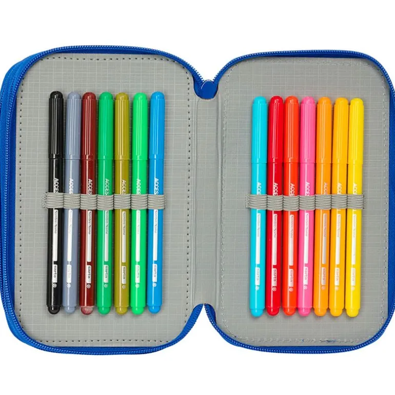 En el interior encontrarás goma, lápiz de grafito, bolígrafo azul y rojo, sacapuntas, regla azul grabada, semicírculo, 16 colorines de madera y 14 rotuladores de colores.
