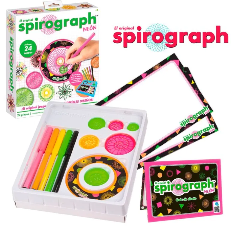 Spirograph Neón viene acompañado a futuros artistas de todas las edades. Podrás crear alucinantes y complejos diseños. Las distintas ruedas y anillos combinan los principios de las matemáticas con los del arte. Incluye 24 piezas y una bandeja para guardarlo todo de forma ordenada. Recomendado a partir de 8 años.