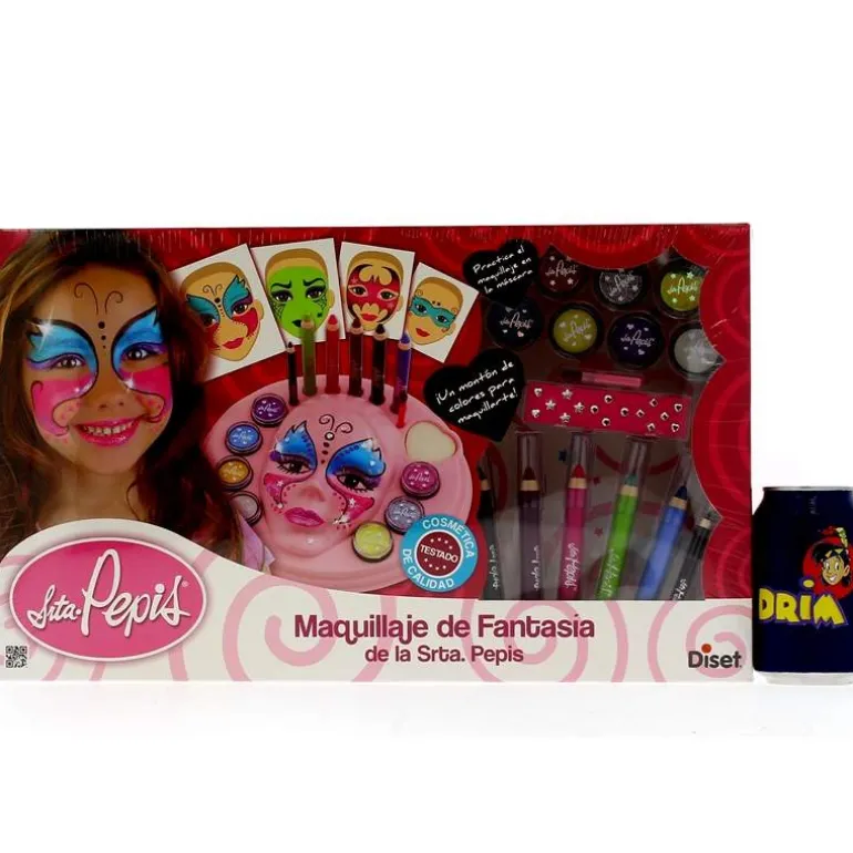 La caja incluye: Base tocador para colocar todos los accesorios con una máscara central para practicar. Láminas con ejemplos de maquillaje 5 lápices de maquillaje 1 lápiz perfilador negro 4 maquillajes en crema 3 purpurinas,1 pincel para darle un toque final a los maquillajes, 1 esponja para desmaquillar.