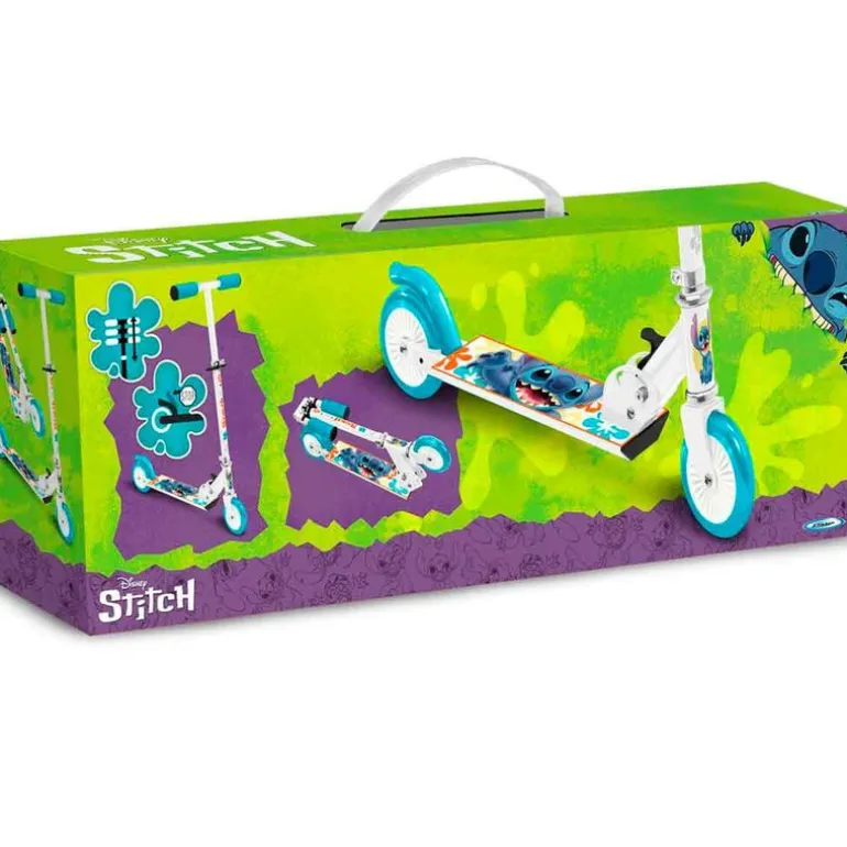 Patinete infantil de 2 ruedas con diseños inspirados en la película de animación Lilo & Stitch. Está fabricado en aluminio resistente y un sistema de plegado para que puedas llevarlo contigo a todas partes. Además, dispone de freno para que puedas controlar la velocidad del patinete. El manillar se regula en altura hasta los 80 cm. Las ruedas están fabricadas en poliuretano con 120 mm de diámetro. Soporta un peso máximo de 50 kg aproximadamente. Recomendado a partir de 5 años.
