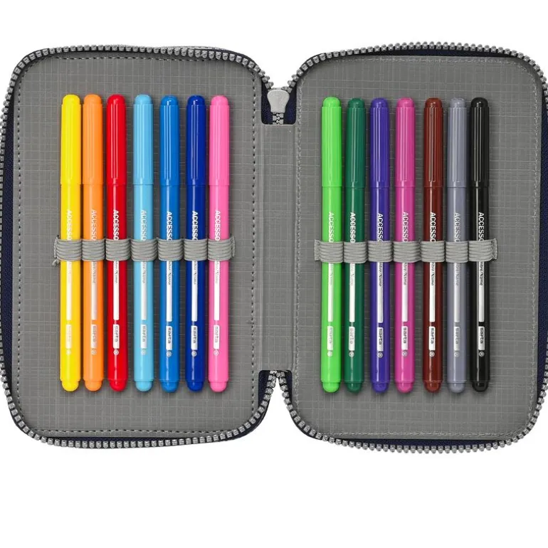 Plumier con diseños inspirados en el videojuego Super Mario. En el interior encontrarás 3 compartimentos en los que podrás almacenar tu material escolar. Contiene lápiz, bolígrafo, reglas, goma, sacapuntas, lápices de colores y rotuladores. Su tamaño es de 19 cm x 12 cm x 5 cm aproximadamente.