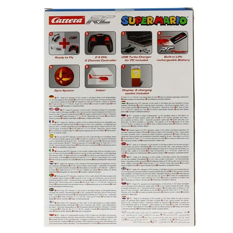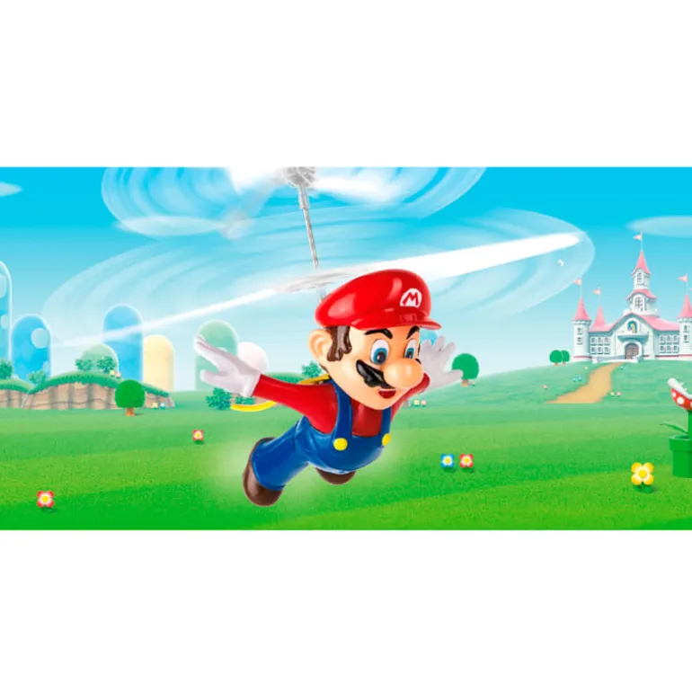 Está diseñado para vuelo interior, y dispone de 2 canales. Funciona con tecnología 2,4GHz Digital Proporcional, por lo que podrás jugar cerca de otros vehículos RC sin que se produzcan interferencias. La figura de Mario mide 10cm y su rotor alcanza los 19 cm.