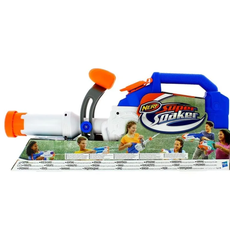Pistola de agua Soakzooka, de la colección Super Soaker. Con su enorme depósito de 1.6 litros, podrás bombear su lanzador para disparar grandes chorros de agua. Podrás soltar hasta 177 ml cada vez. Recomendado a partir de 7 años.
