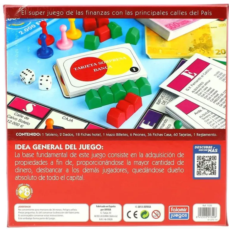 En el interior encontrarás todo lo necesario para comenzar a jugar: un tablero, 2 dados, 18 fichas de hotel, un mazo de billetes, 6 peones, 36 fichas de casa, 60 tarjetas y las instrucciones. Para más de 2 jugadores. Recomendado a partir de 8 años.