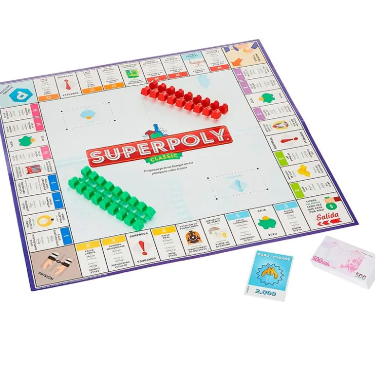 Superpoly es un juego de estrategia en el que el objetivo consiste en la adquisición de propiedades a fin de desbancar a los demás jugadores y quedarse como dueño absoluto de todo el capital. En el interior encontrarás todo lo necesario para comenzar a jugar. Contiene un tablero, un mazo de billetes, 18 fichas de hotel, 36 fichas de casa, 16 tarjetas caja, 2 dados, 16 tarjetas sorpresa, 6 fichas de juego y las instrucciones. Recomendado a partir de 8 años. Recomendado a partir de 8 años.
