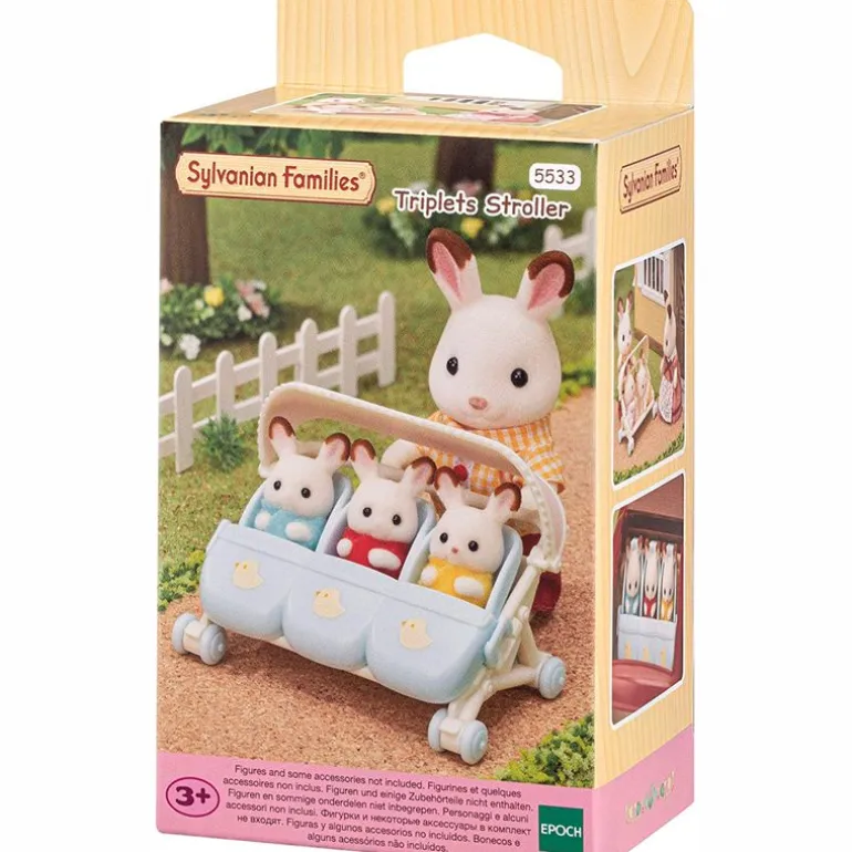Cochecito para trillizos de la colección Sylvanian Families. Un adorable complemento para llevar a tus bebés favoritos. Desmontable y con capota. NO incluye figuras. Recomendado a partir de 3 años.