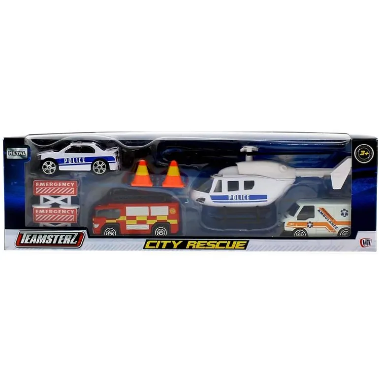 Conjunto de vehículos de emergencia blancos. En el interior encontrarás un helicóptero, una ambulancia, un camión de bomberos, un vehículo y señales de tráfico. Los vehículos están fabricados en metal. Recomendado a partir de 3 años.