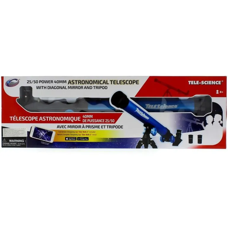 Telescopio astronómico con trípode, ideal para que los niños se adentren en el maravilloso mundo de la astronomía. Incluye 1 telescopio completo, 1 trípode, 1 espejo diagonal, 2 oculares e instrucciones de uso.