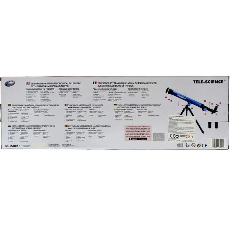 Especificaciones técnicas: diámetro del objetivo de 40mm, longitud focal de 500 mm, 2 oculares intercambiables de 20mm y 10 mm y espejo diagonal incluido.
