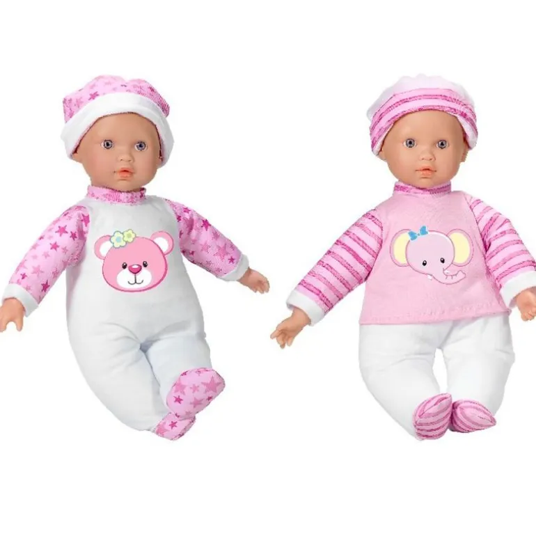 Tiny llorón es un muñeco bebé de 32 cm vestido con ropa de color fucsia. Si le aprietas la barriguita llora como uno verdad. Su cuerpo es blandito pero sus extremidades son duras. No cierra los ojos.