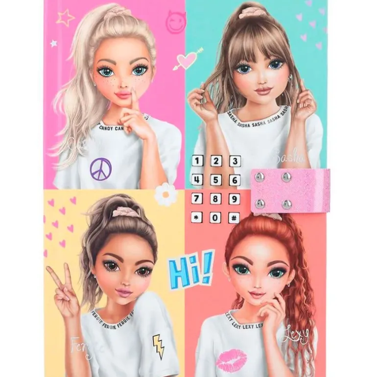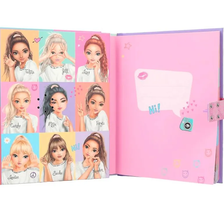 Diario con código secreto y sonido de la colección Top Model. Este diario solo se abre al introducir correctamente el código secreto personalizable. Al desbloquearlo suena durante 20 segundos la conocida canción Shivers. Dispone de 80 páginas con pauta fina e ilustraciones con mucho mimo. Sus dimensiones son de 20.5 cm x 15 cm x 3.5 cm aproximadamente.