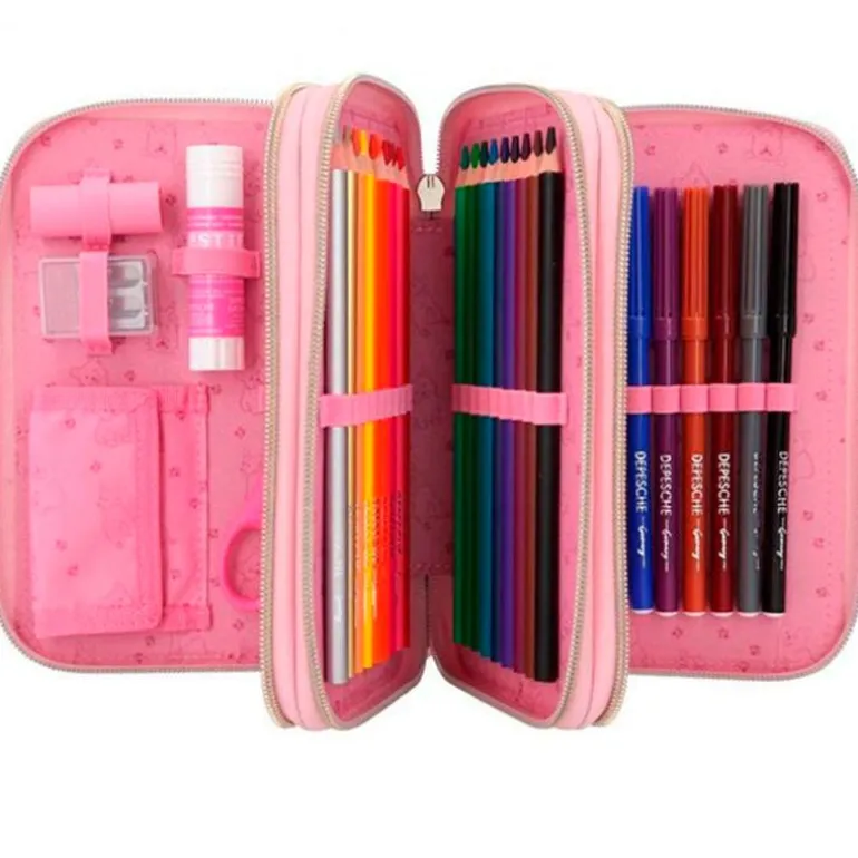 Estuche de la colección Top Model en el que encontrarás tres compartimentos diferentes con material escolar. Contiene 18 rotuladores, 18 lápices de colores, 2 lápices, una regla, una goma de borrar, sacapuntas, pegamento de barra y tijeras. Sus dimensiones son de 21x13x8 cm aproximadamente. Recomendado a partir de 6 años.