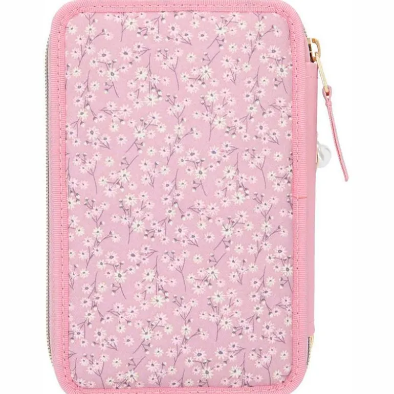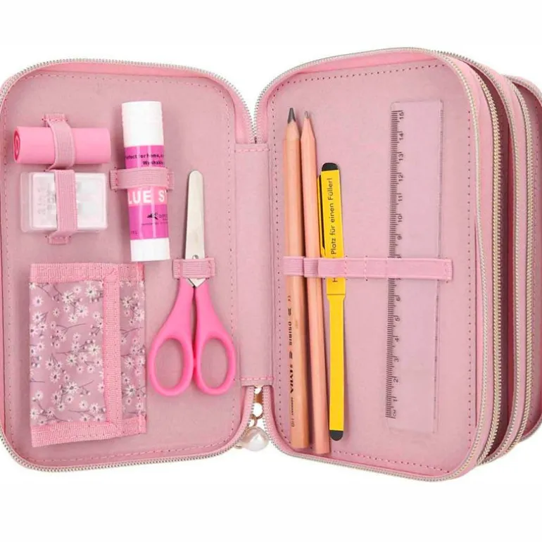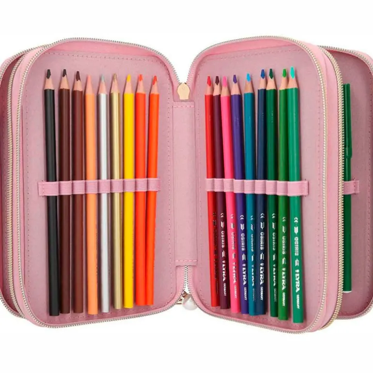 Estuche triple lleno de la colección TOP MODEL. En el interior encontrarás 18 lápices de colores, 18 rotuladores de colores, un lápiz grueso, un lápiz fino, un sacapuntas, una goma, una barra de pegamento, unas tijeras, una regla de 15 cm, una escuadra y un espejo.