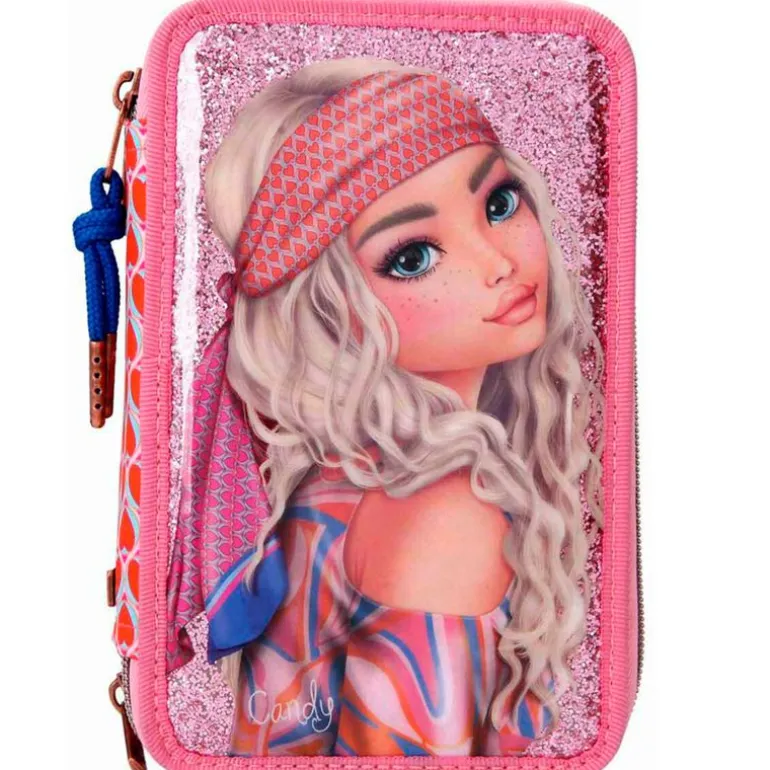 Estuche de la colección Top Model en el que encontrarás tres compartimentos diferentes con material escolar. Contiene 18 rotuladores, 18 lápices de colores, 2 lápices, una regla, una goma de borrar, sacapuntas, pegamento de barra y tijeras. Sus dimensiones son de 21x13x8 cm aproximadamente. Recomendado a partir de 6 años.