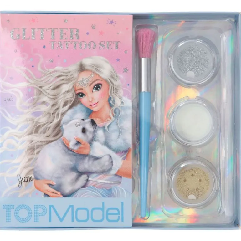 Pack con el que podrás realizar tatuajes de purpurina de la colección Top Model Ice world. En el interior encontrarás 43 tatuajes adhesivos, un pincel y 3 tarritos de polvo de purpurina. Para decorar la piel con motivos maravillosos de cuento del reino de los hielos. Recomendado a partir de 4 años.
