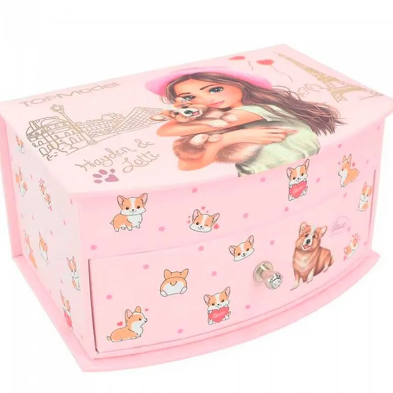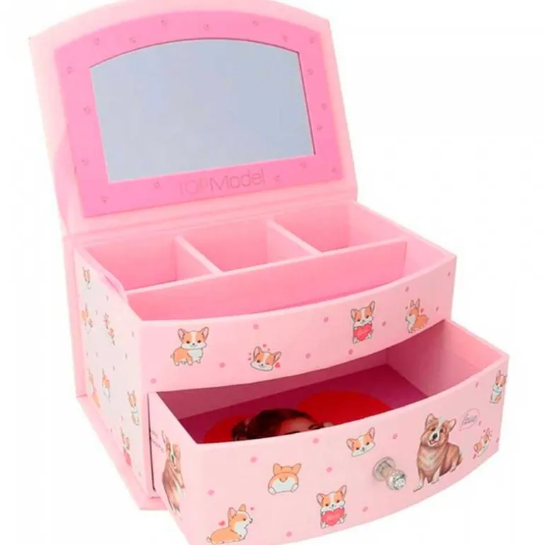 Joyero de la colección Top Model en el que encontrarás un espejo, un separador de ambientes y un cajón para guardar tus joyas o accesorios. Sus dimensiones son de 10.8 cm x 15.5 cm x 8.5 cm aproximadamente.