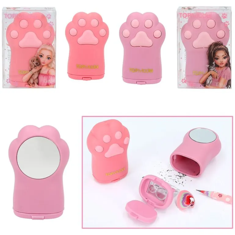 El sacapuntas tiene un dispositivo para las virutas y un pequeño espejo redondo en la parte trasera.