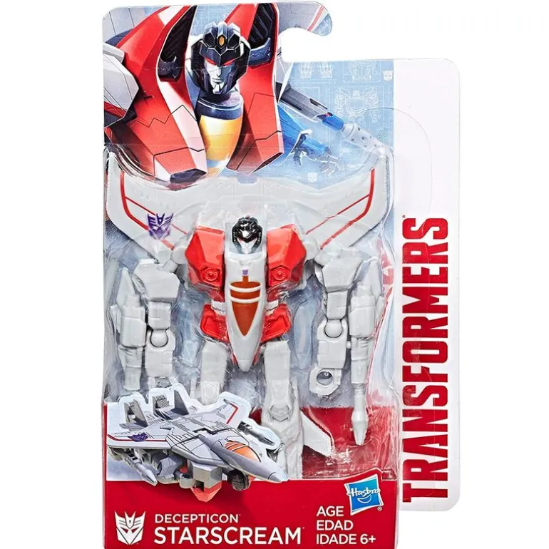 Figura de Starscream miembro de los decepticon de la colección Transformers. Podrás transformarlo en una nave. Recomendado a partir de 6 años.