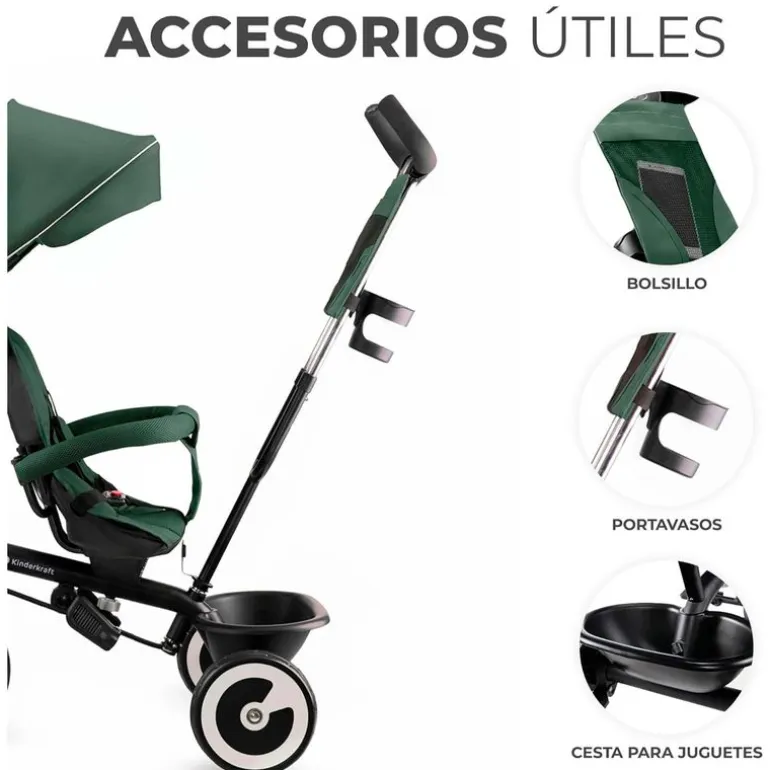 Incluye: una bolsita de paseo, una cesta grande para guardar los juguetes detrás del asiento, un portavasos y un timbre.